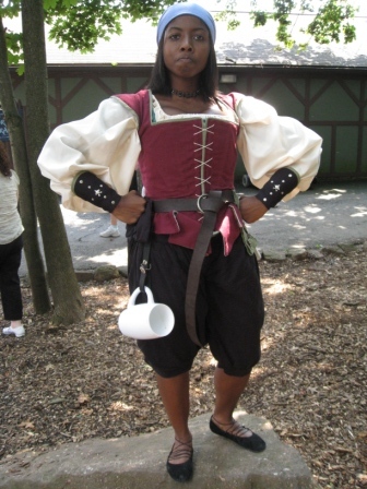 Sunday was another great day at faire. I wore my new studded bracers, which were quite comfy and kept my sleeves out of my food. I didn’t make any garb purchases, although I did try on a Catskill Mountain moccasin, which was a bad idea. It was the most amazing thing I’ve put on my foot ever. I tried on a tall moccasin, which hugged every part of my leg like a glove, and was incredibly soft inside. At this point, I want a pair bad enough to sell my car. Instead, I’ll start looking for garb commissions, find something to sell on Ebay, and save my pennies.
