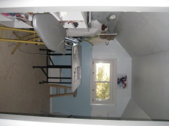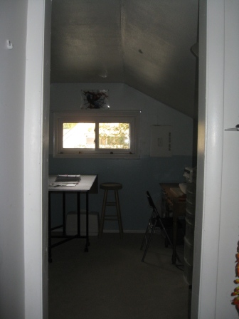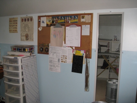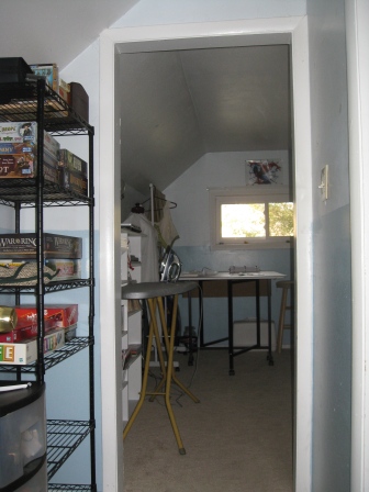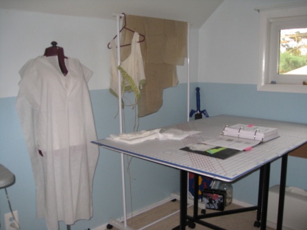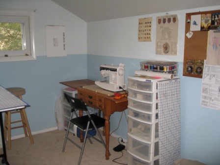 I got the sewing room unpacked (and affectionately named “The Tower”) and I have started my new smock. The walls are currently bare, but I am so lucky to have my own space. Here are pictures of my new crafting home.