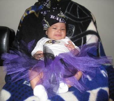 For her majesty, the Ravens gameday ensemble was completed–fleece hat (remnants from the husband’s blanket with sleeves), onesie (iron-on patches), and tutu (ribbon and tulle remnants).