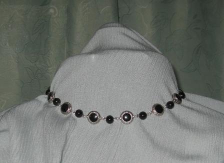 I did manage to come up with a silver and black choker. It started as me trying to learn wire wrapping techniques and ended up with me reorganizing my jewelcrafting drawer (way too small) and finding the little silver connectors instead. I alternated them with black glass pearls.