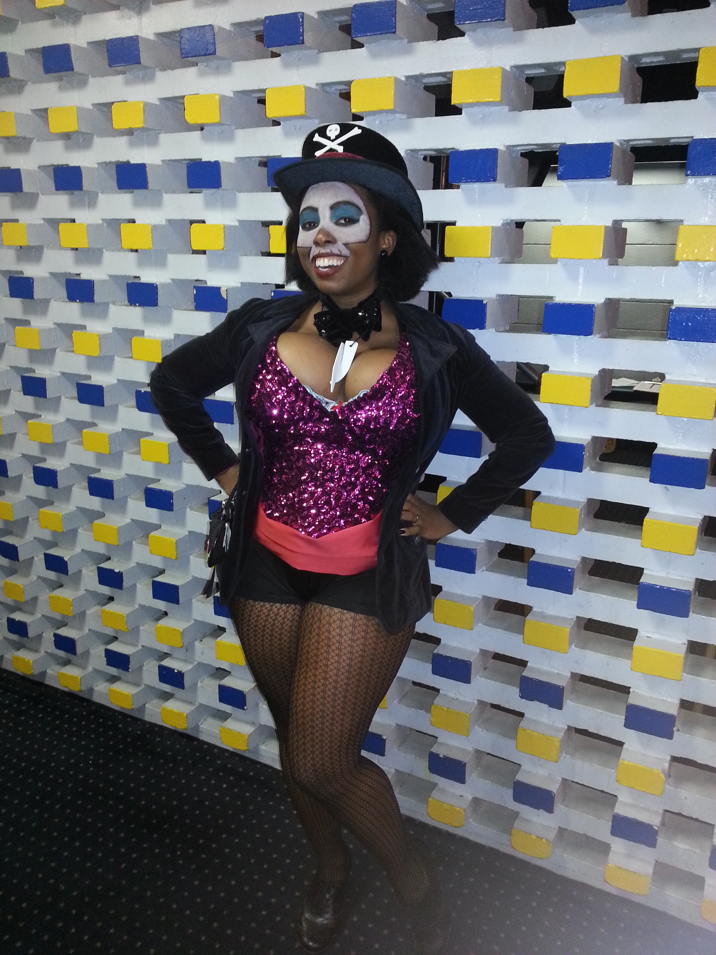 My friend is on the local Rocky Horror Picture Show cast, and convinced me to attend their Disney night. Clearly, I needed a mash-up, so [after drafting a much too complex burlesque Mulan] I happily settled on Dr. Facilier (The Princess & the Frog) as Columbia. Bonus: I had everything on hand. Please note the face makeup is a cross between the floor show and Facilier’s voodoo look. I’m still proud of myself for this one.