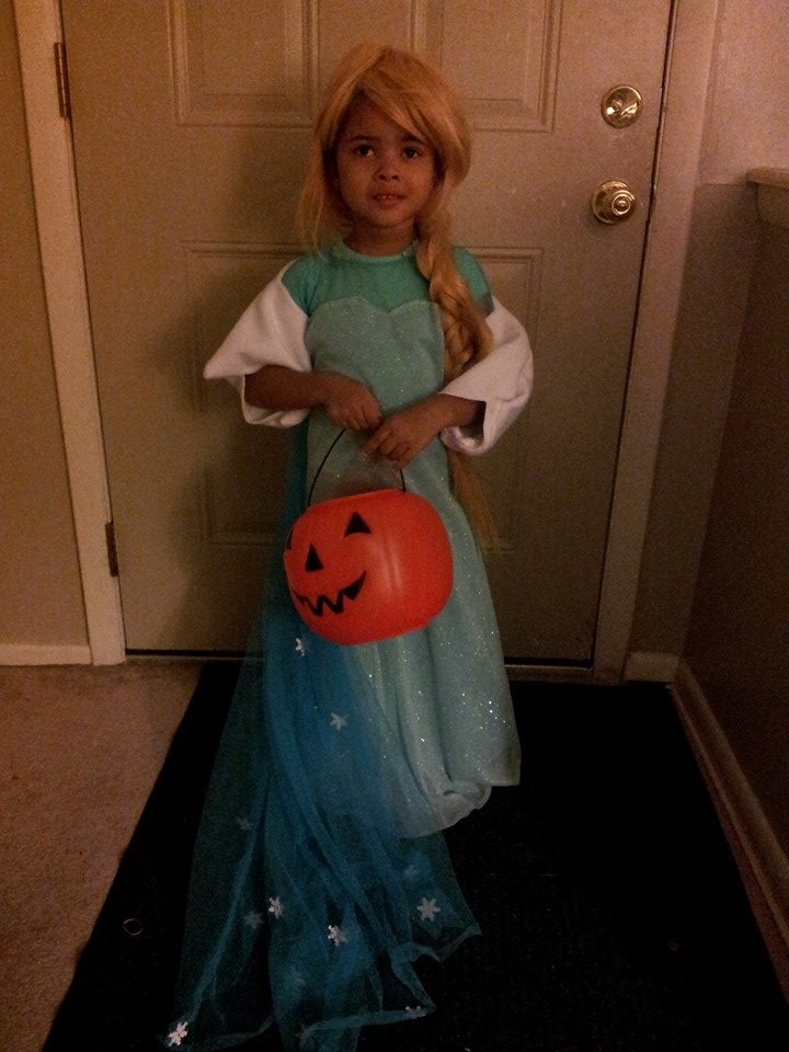The final week of September was devoted to the LP’s Queen Elsa gown. Over the summer, I’d picked up a glittery blue for the main fabric, blue lining, and blue tulle for the sleeves and train. I did some flat pattern drafting for this, based upon her last rennie gown that I made. My mom came in the day before the party to do the finishing and add stick-on snowflakes. The LP also wore the gown for Halloween, so here’s that shot, with the addition of a fleece shrug I made for the chilled weather.