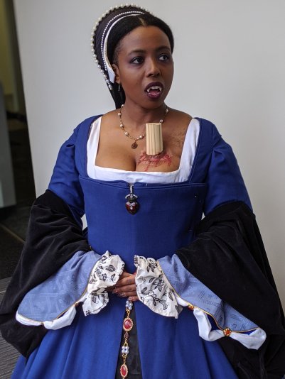 Finally, rounding out what was traditionally the end of my costuming season, we have Halloween. With the number of cathartic rants I’ve had in my “Hallo-whine” Instagram story, this post, that post, and over at the OPP blog, I realized that this year’s work costume needed to come from my existing costume hoard to reduce my mental energy expenditure over dealing with the pettiness of mundanes. And, again, I stuck to the script! Over the summer, I made a couple of fixes to my blue Tudor gown in the sleeves and hem (my two least favorite parts of a gown forever), but didn’t get to wear her to the faire this season. With a new girdle and freshly trimmed French Hood, I added fangs and a poorly placed stake to become a “Mid 16th Century Vampire” (yes, that is how I titled my costume contest entry). The idea is that my assailant missed the mark, hence my continued undead animation. This was my first time working with latex paste, and, despite the lack of blood–because I didn’t want to clean it up–I’m extremely pleased with the look.