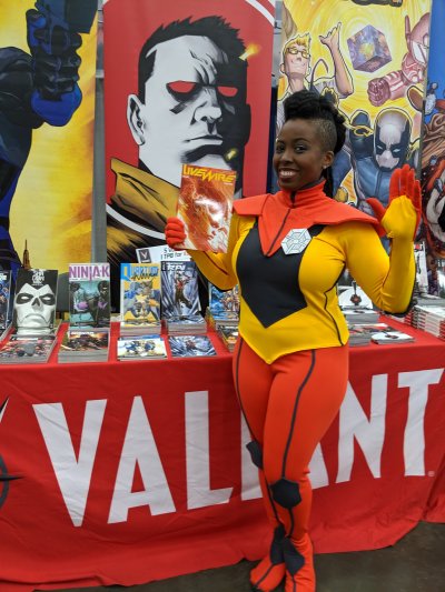 Thank you. In addition to packing during my week off, I gave Livewire an update by finally sewing on all of the contrast and joint pieces. Outside of that, Hench Hubby opted out of playing dress up, the kids chose costumes they already had, and my only goals for the weekend were to get some signatures and photos in my Blink and Livewire costumes at the Sanford Greene and Valiant Comics booths. The weekend with friends and family was fun, as always, and we even had time record a podcast episode (you should listen to it).