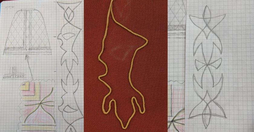 So, here I sit on the bedroom floor, happily avoiding the piles of clean clothes waiting to be put away (and the younglings asking for food). Saturday mornings are reserved for basic housework before I allow myself time in the studio–clutter I can deal with, but I will not live in filth. I’m watching Noelle painstakingly appliqué teeny train tracks to her bustle gown, and I’m inspired to finally cut and fuse Zelda’s glyphs to the surcote hem so that I can move on to the white kirtle that I added to the Medieval Legend of Zelda project last month…because details. I am similarly inspired to stop tiptoeing around the couching design that I’ve been working on for Hawkgirl’s petticoat this week. The first design was a start, but didn’t reflect the extravagant simplicity of the era. I made some edits and now have a lovely repeat for the center front, but I find myself wanting to add filler embroidery and spangles and true goldwork and and and….