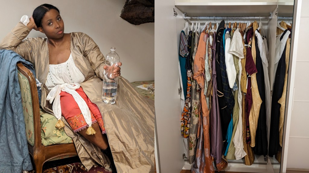 In the bag, but not on my body was the stripe-y Anglaise from The Depths. Pleating the back involved tears, phoning a friend, and then completely giving up and just getting it done. I’d taken this one specifically for the fancy opera, but after a day of handling strangers badly, I didn’t want to manage my hoops into a tiny box with more randos. I only had seven yards of taffeta for the gown and petticoat, and I pieced the ruffles together from scraps. Upon returning home, I promptly put the gown into a storage bag and left her there until spring vacation. After taking the time to do my hair and makeup for some overlit cellphone photos, I realized that the pocket slits are wonky and the sleeve fit is not great. I couldn’t even be mad though because I didn’t rush construction, and I checked everything twice. Sometimes it just doesn’t work out.