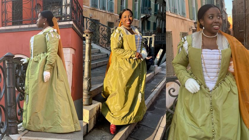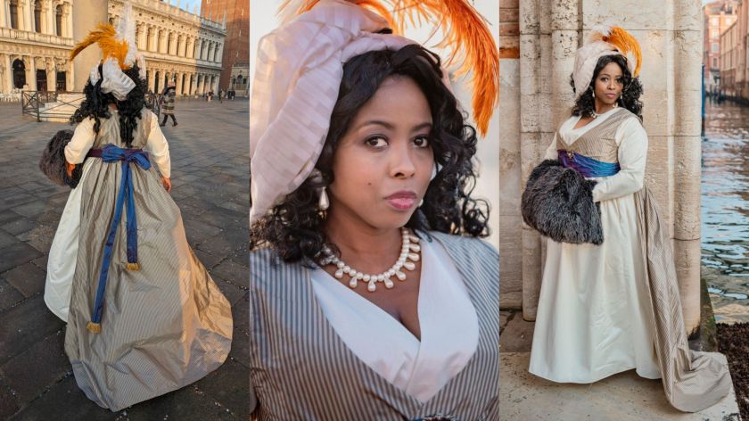 Onto the fantastic…creamed cod cicchetti. Like, why was it so good at every place we went? I also didn’t expect to have to wean myself off of sparkling water. There were some concerns for my hydration level, but I lived. If anyone wants to pony up for a fizzerator or whatever they’re called, feel free to $$$ me. I attended two operas during our week–The Barber of Seville at Teatro de Venice and La Triviata at a Palazzo Opera. Did my eyes close a few times? Yes, but the environments were cozy and I’m more of a dance show girlie, if we’re being honest. I got to be a part of the somewhat interactive palazzo performance for which I was wide-eyed through the first act. I’ll also say that getting ready for outings with our crew was a delight! I enjoyed my roomie’s music and yelling for more pins (hair, safety, and straight), group votes on accessories, and of course sitting around in our underpinnings while stitching. Camaraderie really makes the experience. Since my costuming prep through the years has largely been solo or me being responsible for literal children, I’ve rarely had help getting laced or seeing how other people fight their hair into submission. It was refreshing.