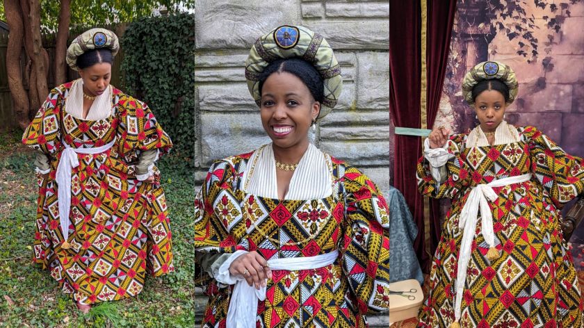 Finally, my Fusion gown never made it on the plane. She’s a 1530s Florentine in wax print, reminiscent of playing card art. This was a Margo/Period Patterns combination, and I absolutely love the fit. I used more bits of Medieval Tiana’s bronze lutestring for the sleeves, so I really need to stop pretending that any of the Princess Tiana gowns I’ve started are actually going to happen. She’s worn over my corded petticoat and I lined the puffy bit of the sleeves with silk organza. I took a day before snapping pics to experiment with balzo construction. I was going to stick with a more diasporic headwrap, but balzos are weird and so am I.