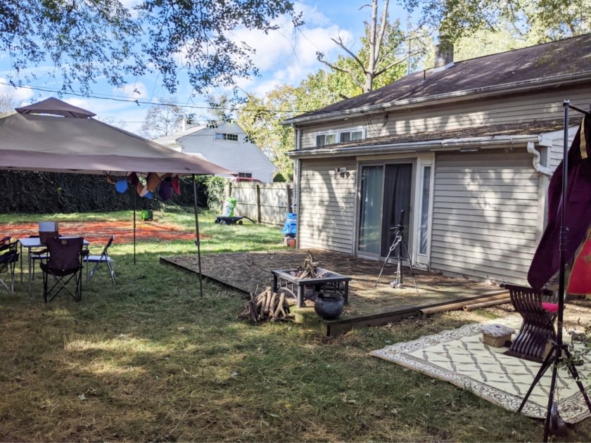 Since we only had one electrical outlet, I put the bubble machine between the garden and the porch. Bubbles mean fairies, so I filled a vase with colorful beads and a small pair of old wings to dress up the area. For safety reasons, we kept the porch section mostly clear since that’s where the fire pit lives. The bluetooth speaker sat next to the door, and the tripod was placed in front of the photo space, completing the setup.