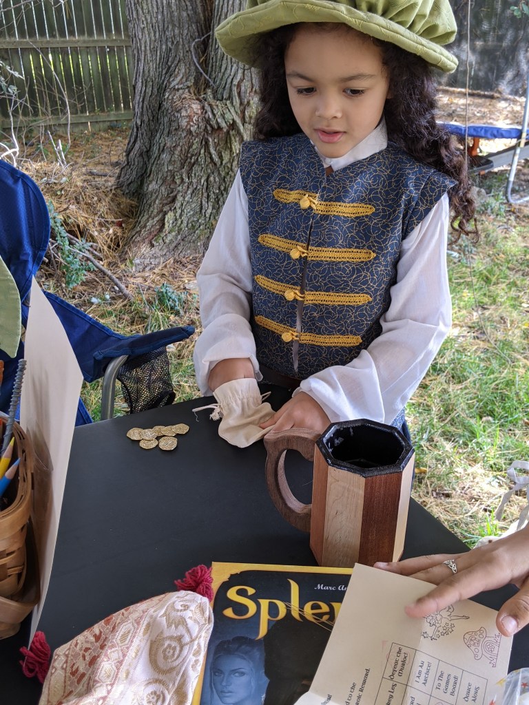 In this home, we impress upon the kids to always be learning–useless trivia does come up often, but life skills are preferable. To that end, I made the little consumers pay the Provisions Master for their food items with pirate gold. We also used a book of Shakespeare’s poetry, which the eldest read beautifully on the porch stage for a stamp.