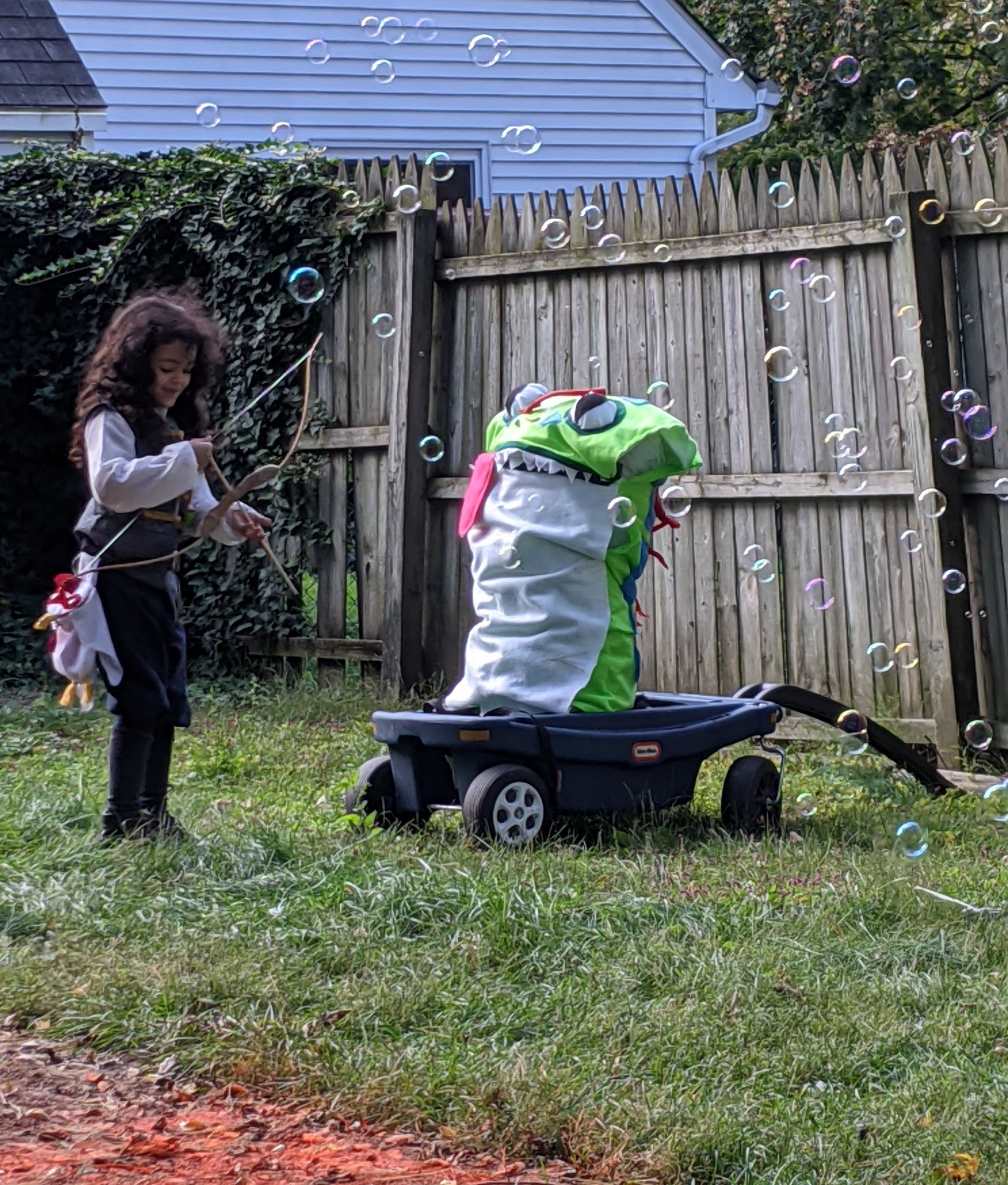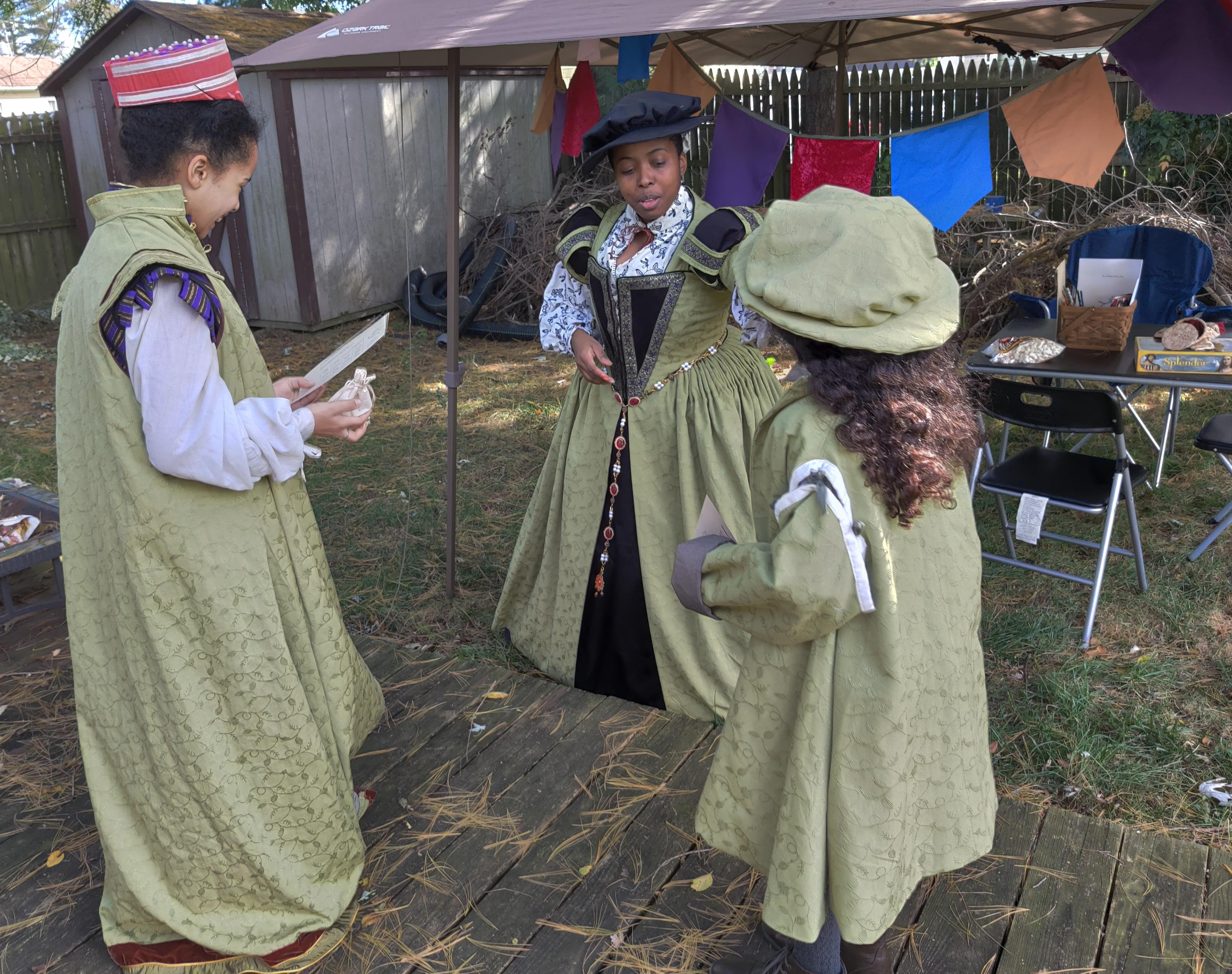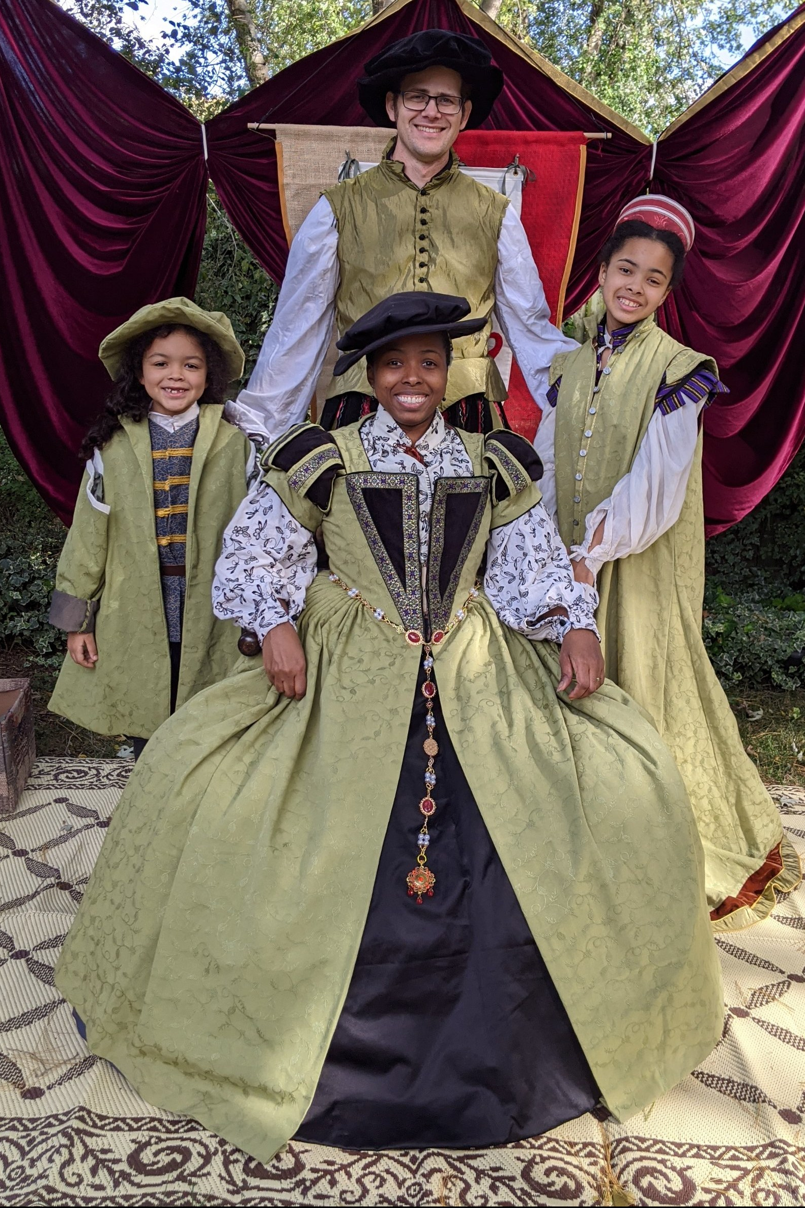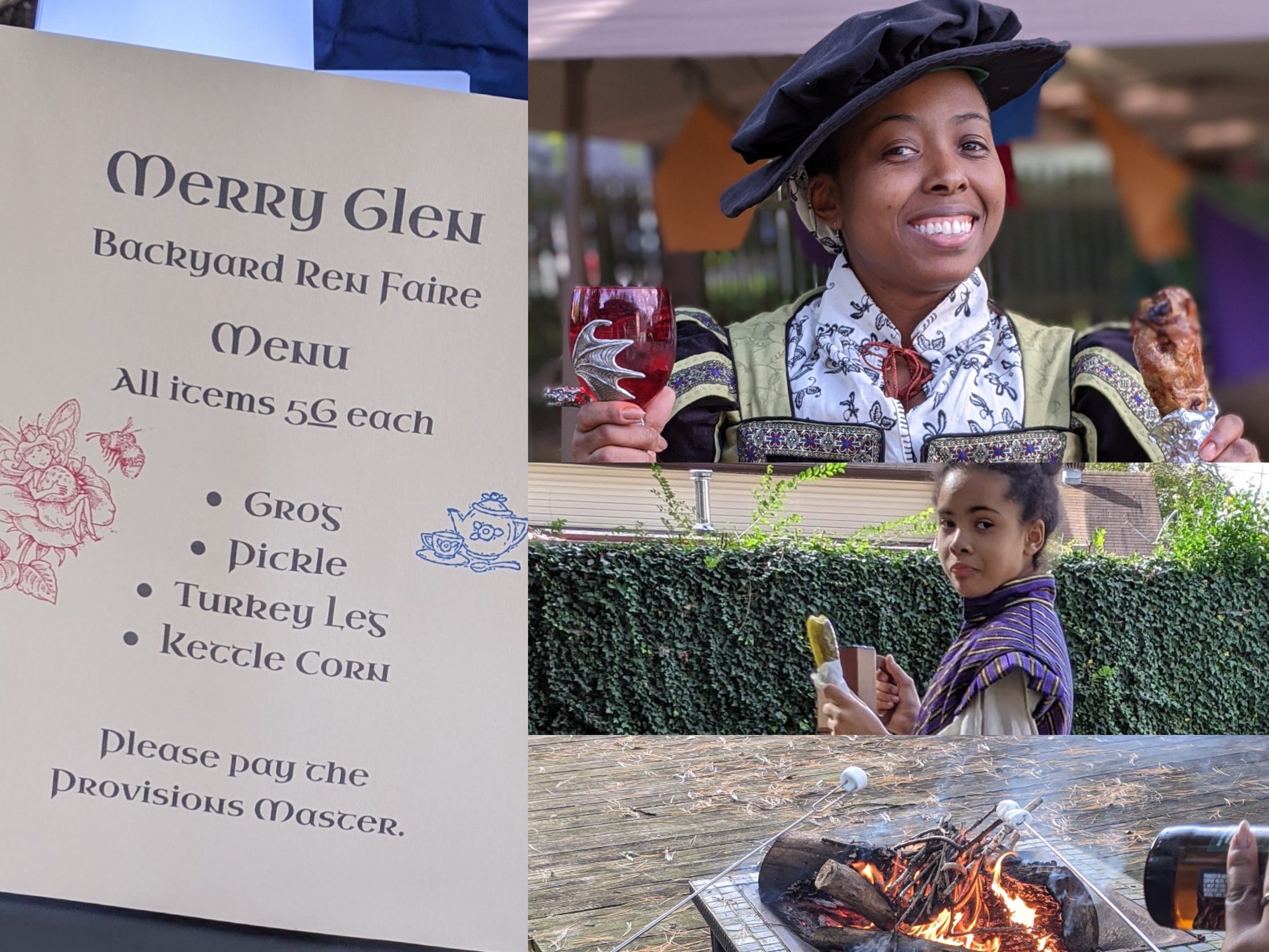 Hench Hubby and I have been attending local-ish renaissance faires for 15 years. It’s how my lifelong love of historical costuming was made into something real. The kids have been attending ren faires since infancy and have affectionately labeled the fests “The One With the Playground” (NJRF), “The One With the Pickles” (PARF), and “The One With the Trees” (MDRF). So when an actual plague broke out and put a halt to our annual event season, our family was crushed. My wonderful spouse offered to make turkey legs while we sat out at the fire pit with some good music, reminiscing about the before times. Never one to miss an opportunity to get dressed up, I also wanted to pull out our rennie gear. Under the guise of “thinking of the children”, the Merry Glen Backyard Renaissance Faire was born.