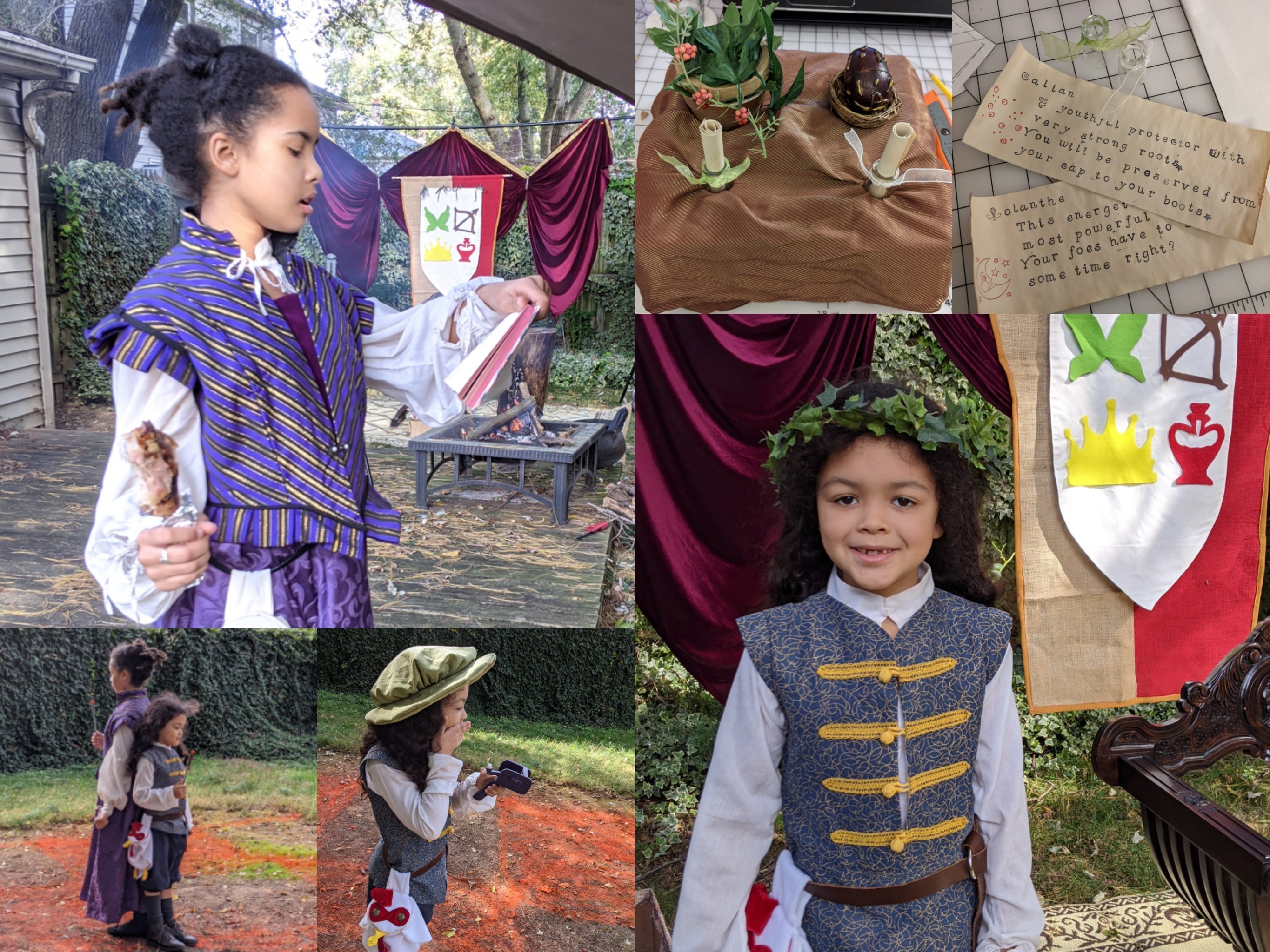 To figure out what to do other than just munch on oversized drumsticks, I pulled up the daily schedule for our favorite ren faire and went through each block, scribbling down notes for at-home equivalencies. Stage combat, games, and photo ops all seemed doable with items we already had around the house. It was decided that a balance beam and juggling would likely result in a hospital visit, so that was crossed off the list. I did consider putting up recorded performances of some of our faire-vorite acts, but adding screen time in the current ALL-OF-THE-VIRTUAL-THINGS climate is a slippery slope and might have taken us out of the moment.