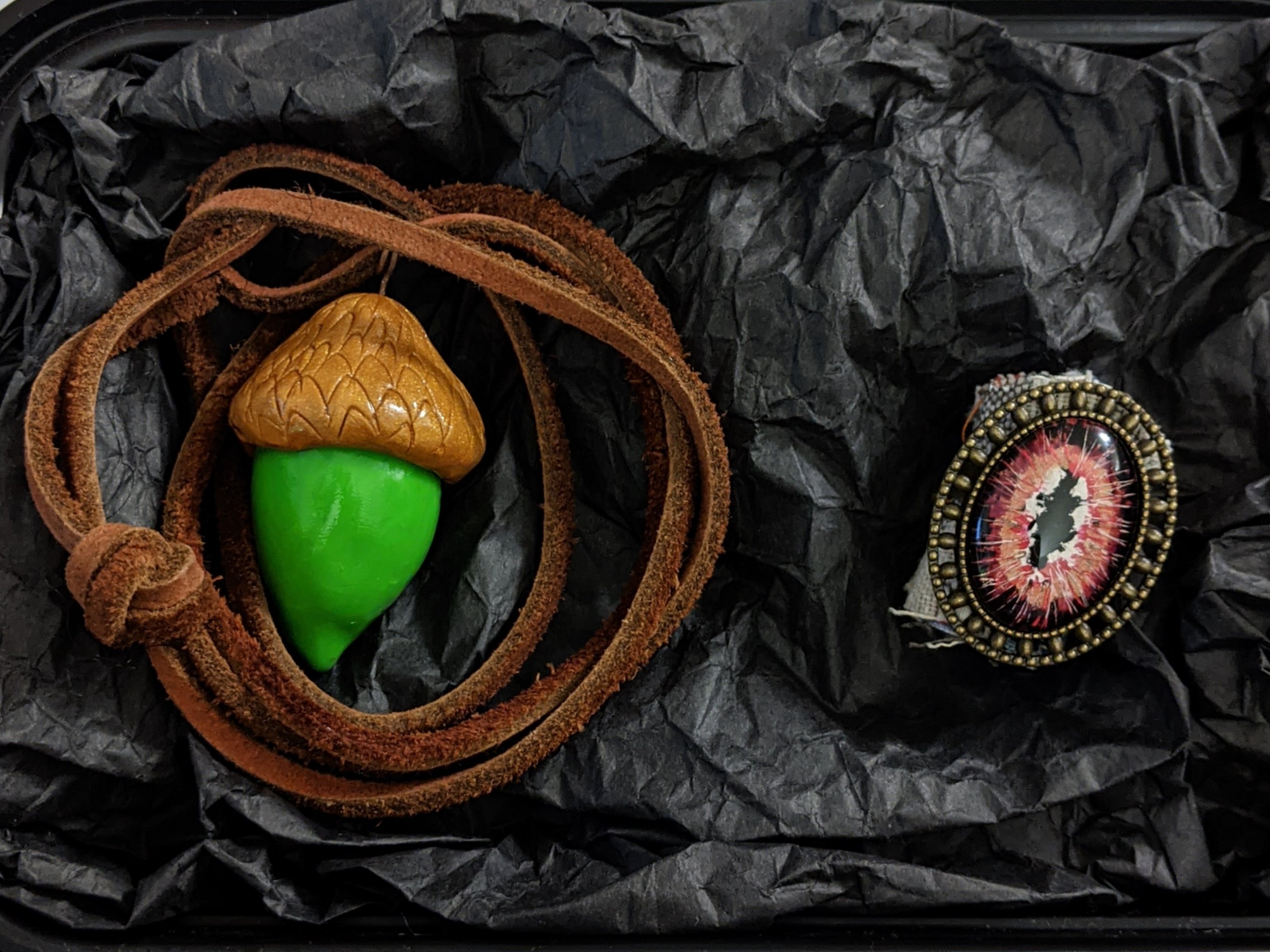 Over the course of the preceding two weeks, as fate would have it, both kids managed to unknowingly pick out what would become their quest items–an acorn necklace and a dragon eye ring. They got the ideas while I was shopping online for fall jewelry with one of my favorite vendors. Now, I cannot justify beautiful, one-of-a-kind pieces for a 6yo or a 10yo, but I did have a selection of jewelcrafting materials readily available for costume bling. With some YouTube help, I whipped up the items, added some set dressing and flavor text, and presented our heroes with magical rewards for their lasting happiness.