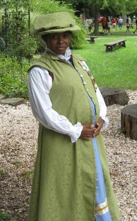 As you can see from the previous pictures, I have a green hat. That was a last minute addition, the night before faire, done completely by machine in about 40 minutes. Those of you familiar with hat making, or, at least, MA hat making, know that there is a fair amount of handsewing involved. I didn’t even bind the wire to the plastic canvas frame by hand. Well, I did, but not with thread…masking tape is an under used tool…. For anyone left reading this after that last bit, I’ll continue. I used leftover felt to pad the canvas and found out that plastic canvas can go in the sewing machine as long as you go slowly. Instead of pressing in the seam allowances on the fashion fabric and slipstitching the pieces together, I turned the brim inside out, stitched the outside, flipped it, and forced the base inside. My justification was easy: the hat is supposed to be bendy anyway. Once inside, I put the brim back into the machine and stitched the inside closed. I gathered the crown and stitched that to the inside. I did skip the binding step because I was really tired, but I plan on getting it in before the next wearing. I acknowledge that I took cheating to a whole new level on this piece, but at least I didn’t have a chance to use my glue gun….
