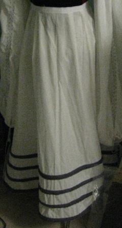 To my surprise, sewing down the channels and threading the cording through them wasn’t the bear that I thought it was going to be. Pinning the channels down was monotonous, but not awful, and well worth the time that it took. I will absolutely do another one of these, but I plan to use a more interesting fabric, with ONE complementary trim for the channels. I ran out of gray on the last spiral, so I switched to brown, since it was unlikely that my gown would get up that high. On the next one, I will also decrease the space between rows. Two inches isn’t useless, but I wouldn’t mind a heavier petticoat, as strange as that sounds.