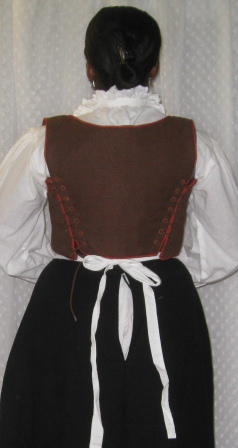The side-lacing bodice is untabbed without shoulder treatments. It’s made of brown embroidered linen and is piped with rust cotton broadcloth around macrame cording. It is flatlined with canvas, interlined with heavy linen, and lined with brown cotton broadcloth. The eyelets are handsewn (badly) with brown craft thread. I’m considering switching to satin embroidery floss in the future.