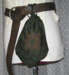 The bodice is bound with brown cotton broadcloth. Because I wanted this to be a quick project, I didn’t line the bodice, and I used gold metal grommets. It is laced with brown macrame cording. My only issue is that I need to double the number of lacing holes. I only had one pack on hand, and I’d hoped to go to faire the next day, so I wanted to finish. No worries though; I’d already marked the placement, so I just have to get the grommets set. The wench-y purple chemise is from Jennifer Thompson’s Easy Italian Chemise tutorial. Since I had just a bit of remnant left, I made a quick pouch, embroidered with Celtic knot work. The metallic thread makes the design pop. I love it! As soon as I find my brown grosgrain ribbon, I’m going to add a loop to the inside lower right edge of the bodice, above the binding. Then, I can tie my pretty pouch from the bodice rather than wear a belt.