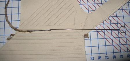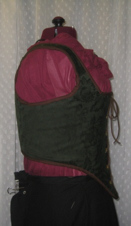 The bodice is made of a forest green stretchy damask (maybe) over two layers of unbleached canvas. Since I was using remnants, I had to piece the straps on, but the rest of the bodice is in one piece. I really wanted to do a corded bodice, so this one has jute in the boning channels rather than my usual cable ties. For the long bits, I used a tube turner hooked to a bodkin, then wire to get the jute through. For the interior bits, I slashed the inner edges of the channels, pulled the jute through, then stitched across the channels. The two center channels (front edges) do have cable ties. In the fourth picture, below, you can see that there’s a slight crease at the waistline. The cable ties, added after that picture, give just a bit more stability.