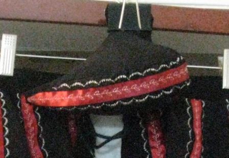 For the collar and shoulder treatments, I went with short tabs, and I love them. I guesstimated the size that would look best, added a short seam allowance and started cutting and serging. After turning each rectangle with my little finger and pushing out the corners with a small ruler, I basted them to the doublet, stitched in the lining, and pressed everything out and down. The result was exactly what I wanted. The tabs have no lining, flat-lining or interfacing.