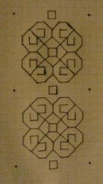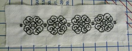 Shirt – His old shirt has seen a lot of wear, and isn’t classy enough for the fabrics he’ll be wearing this season. The shirt is being done in white cotton broadcloth (I really didn’t have the patience to wait for linen to go on sale) and will have blackwork at the cuffs, collar, and edging along the ruffles. I plan to pleat the ruffles–I know, fancy! This is my first attempt at embroidery, and I’m optimistic. The first picture is the original design that the husband picked out. The second picture is the design reworked to fit the shirt pieces. The third picture is the first completed cuff, which took about three hours.