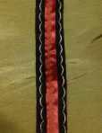 After I got to the “end” of the doublet and realized that it was too short, especially with the hopes of including an eyelet strip for tying up his slops, I added skirting. Since I wasn’t about to slipstitch the whole lower edge, I made the skirting and eyelet strip separately and stitched them together to the bottom of the doublet with a 1/4 inch seam allowance. It was touch and go, but no needles were harmed. I added the corresponding eyelets (small silver) to the slops waistband and used black macrame cording to tie them. I don’t have a picture, but, I promise, it’s easier to tie the pieces together than fixing shifting clothes all day.