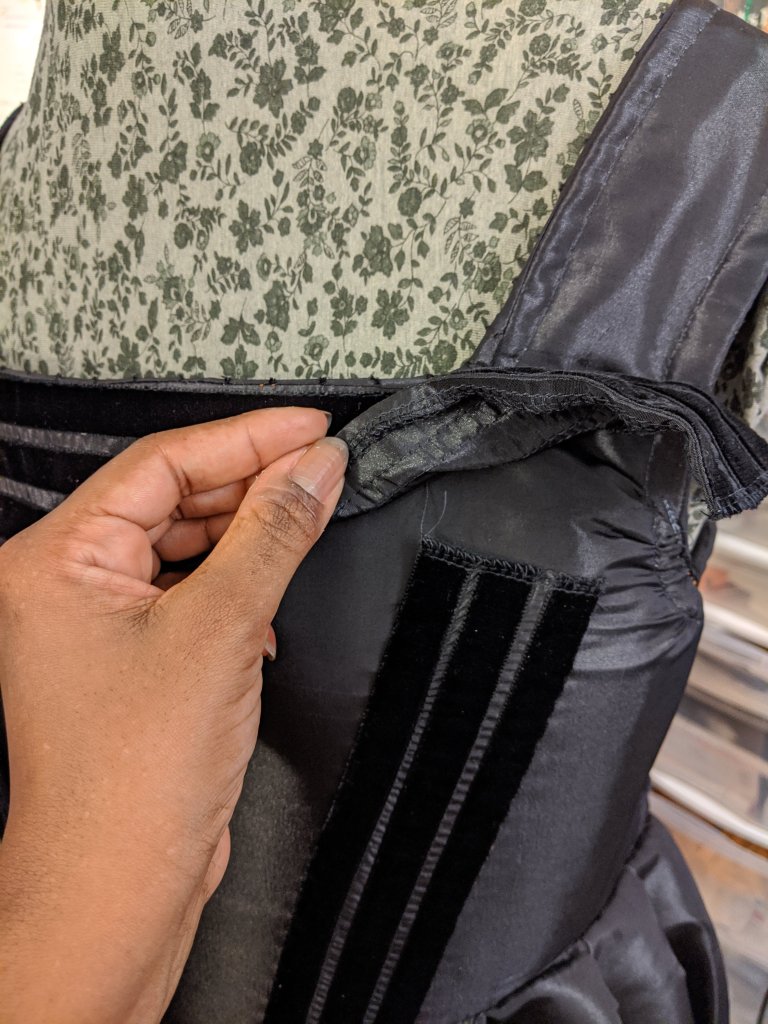 We can only see the bodice of the gown in the portrait, so I had wiggle room on the design. I knew that I wanted a train for full length photos and that the sleeves should be sewn in rather than laced. I chose to pleat the skirt, which is always a math equation, but I prefer that to gathering any day of the week. Looking back, I feel like I should have added another panel to the front–the center seam is incredibly distracting, and the pleats need something more. However, the flat front is the shape I expected, with the exception of the wonky pleating. The bodice has a core of heavy duty fusible interfacing, as similarly used by Shushanna in her gown. After a test fit, I added a boned, diamond-shaped belly piece to prevent breaking/wrinkling/curling when I sit. The flatlining is a canvas-like woven print. The interlining is a thin white velour. The fashion fabric is black poly taffeta. The bodice lining is a yellow cotton print, but the sleeves are lined with what I think is rayon, also in yellow. The trim is strips of 16mm black velvet ribbon stitched directly to the sleeve fabric, but attached to strips of taffeta for the bodice before being tacked on by hand.