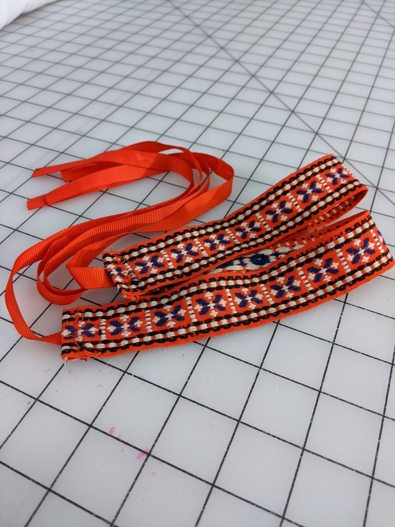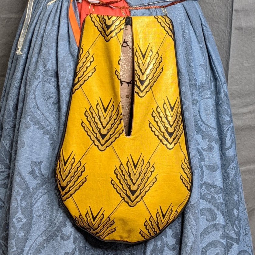 The saccoccia is a beautiful pop of color! The fabric was in a pile of African prints that I received from a family member. It’s lined with a printed linen, piped on the edges, and has lacing rings at the top. I didn’t make any sottana access due to some issues with the skirting, but moving the pocket to the side back opening isn’t a hardship. Without the outer gown, I’d still wear the saccoccia over the petticoat. It’s pretty.